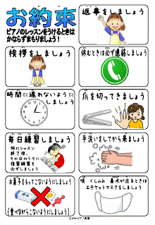 レッスンの際に必ず守って欲しい事柄をまとめました。生徒さんも、これから始めてみたいと思ってらっしゃる方も、ご覧ください。 ・ピアノレッスンの際のお約束 ![]() |